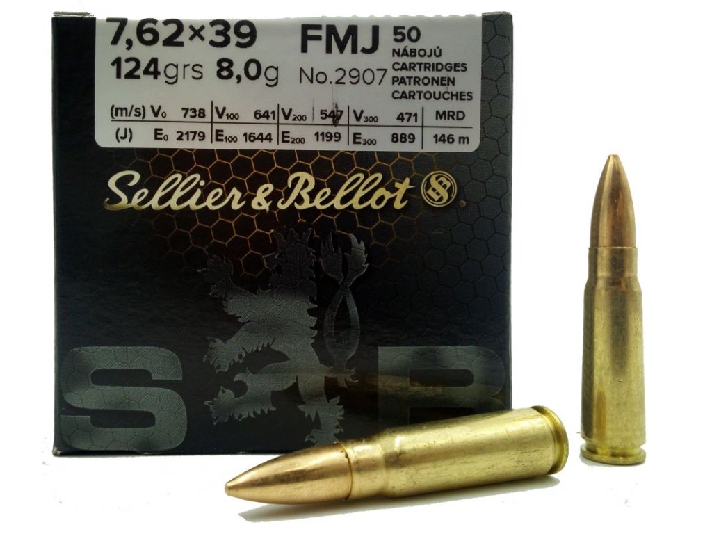 Kulový náboj od českého výrobce Sellier&Bellot 7,62x39 (celoplášť), střela 2907